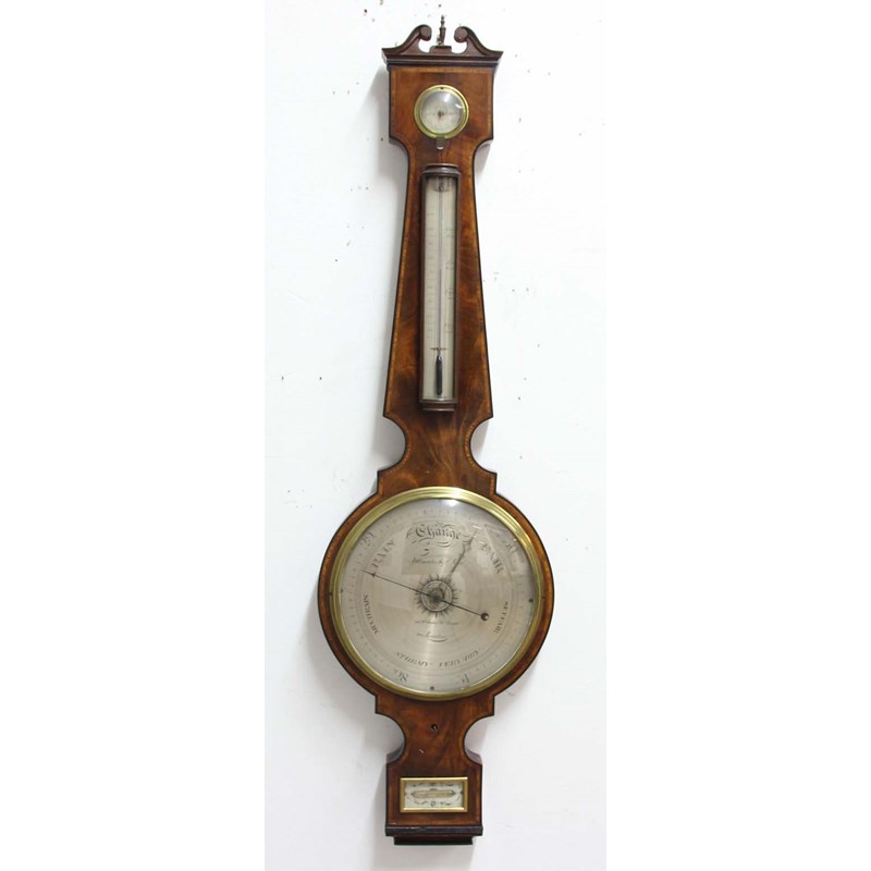 REGENCY MAHOGANY AND CROSSBANDED WHEEL BAROMETER,