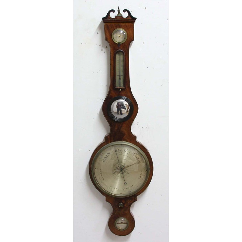 REGENCY MAHOGANY AND LINE INLAID WHEEL BAROMETER, the hygrometer above a thermometer, mirror and silvered main dial, the spirit level inscribed Angani, Newcastle, Warrented, height 110cm