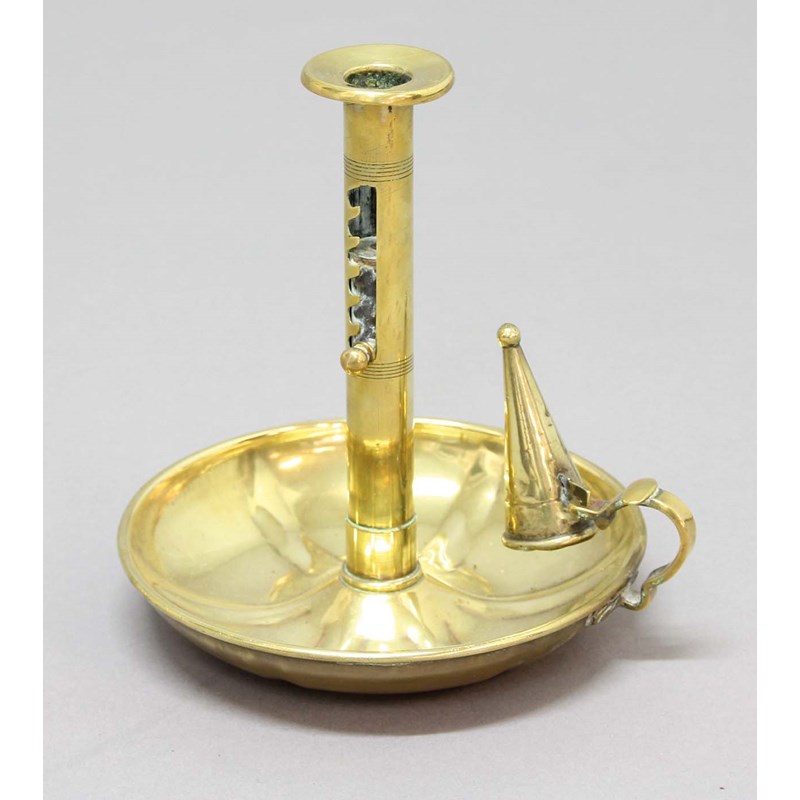 BRASS CHAMBER STICK AND SNUFFER, 19th century, with ratchet ejector, height 20cm