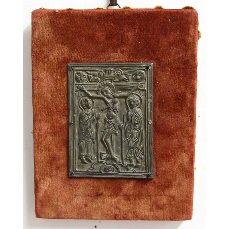 19th century, probably an electrotype, depicting Christ on the Cross, the Virgin and St John looking on, on a velvet mount, 9cm x 6.5cm