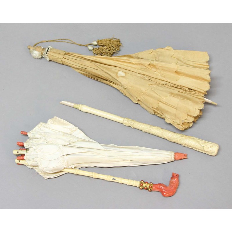 the ivory shaft carved to emulate bamboo, a gilt metal band with coral cabochons and coral handle carved as a lion's head, coral flower bud finial, length 57cm; together with another bone handled parasol (2)