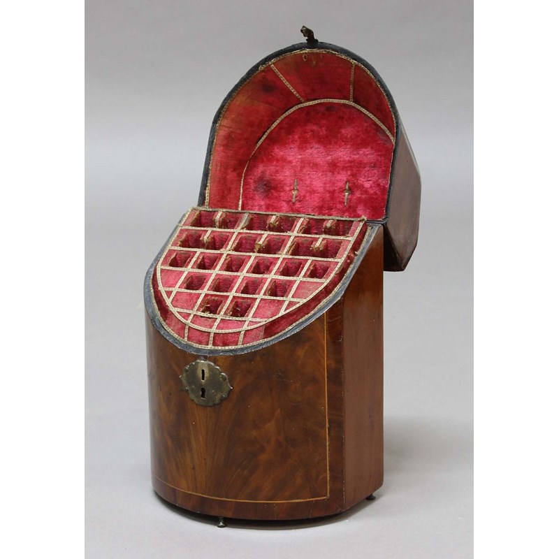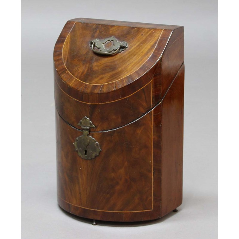 GEORGE III BOWFRONTED MAHOGANY KNIFE BOX, with original, velvet lined, fitted interior, height 33.5cm