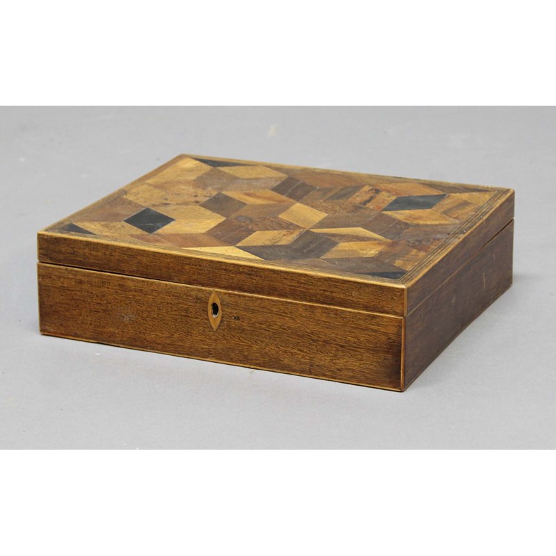 early/mid 19th century, the cover with geometric inlay enclosing a fitted interior, height 8cm, width 28.5cm, depth 23cm