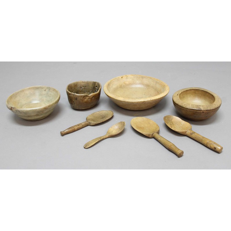 a collection to include a sycamore dairy bowl, two further turned bowls, burr or curly birch wood bowl and four various spoons, diameter of bowls 31cm to 16.5cm (8)