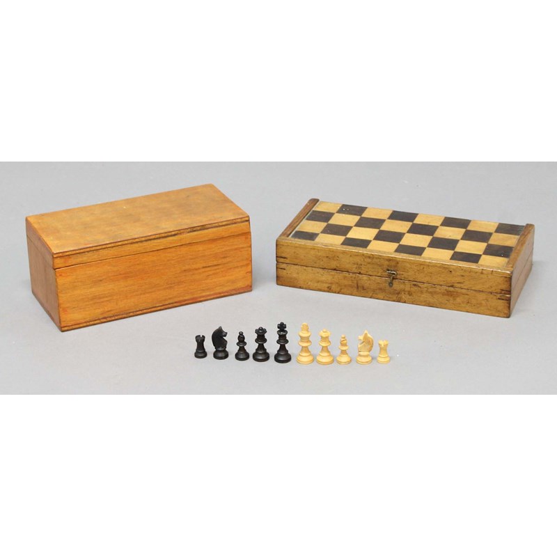 19TH CENTURY CHESS BOX, with turned miniature boxwood chess set, box length 31.5cm, height of king 5cm; together with another box (2)