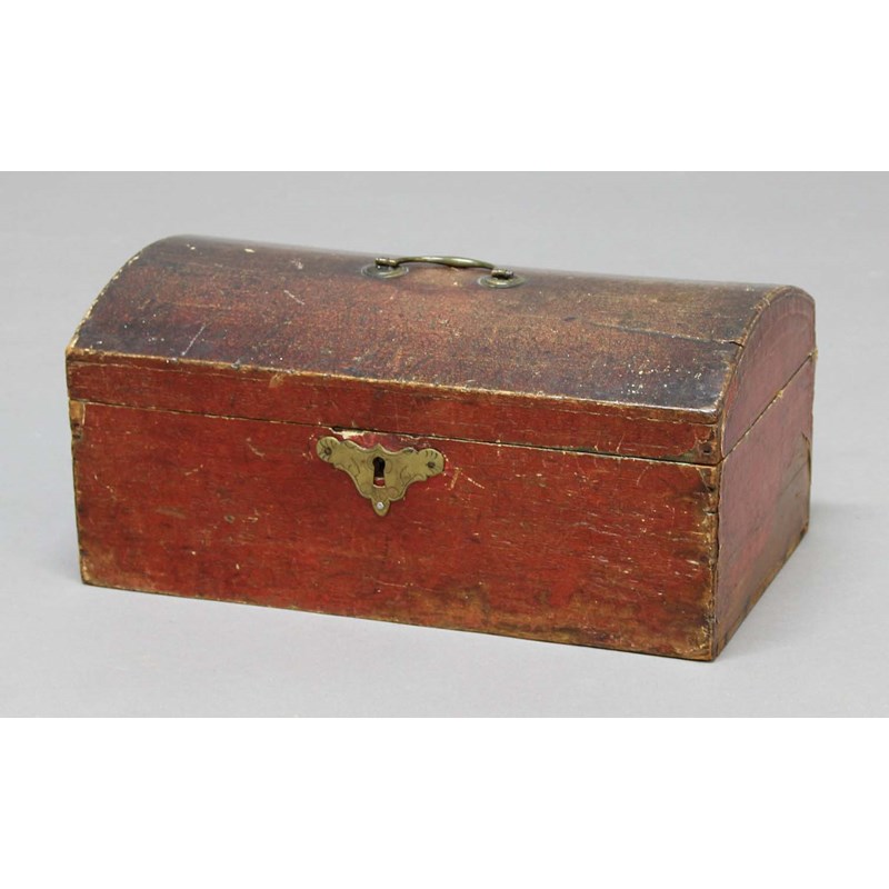 GEORGE III DOMED DOCUMENT BOX, probably early 19th century, textured paper bound and red painted, with swing handle, height 17cm, width 36cm, depth 20cm