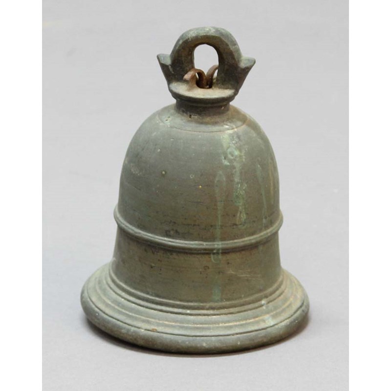 BRONZE BELL, possibly from a ship, with iron clapper, height 17cm