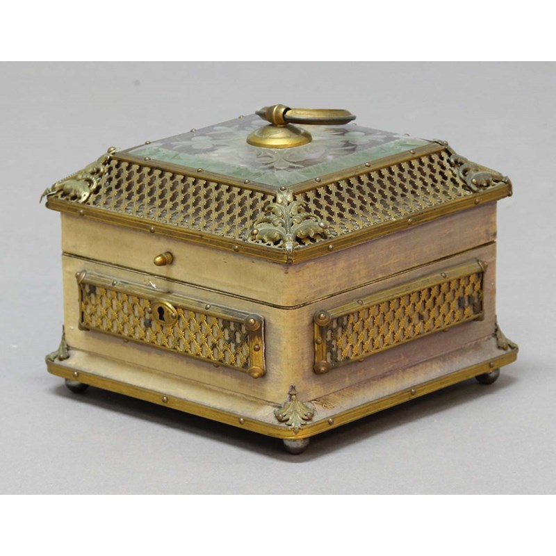 later 19th century, the cover with engraved glass panel inside trellis work on a base with silk and trellis panels, acanthus leaf corners, height 17cm, width 19cm, depth 19cm