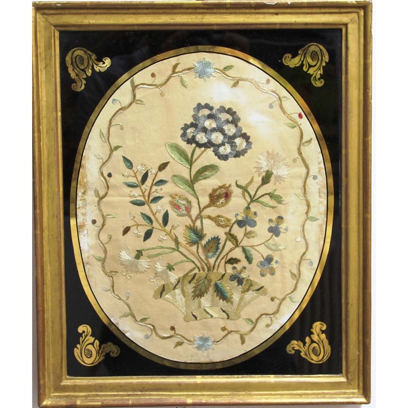 OVAL SILKWORK PICTURE, early 19th century, of a basket of flowers in a verre eglomise mount, image size 32cm x 26cm
