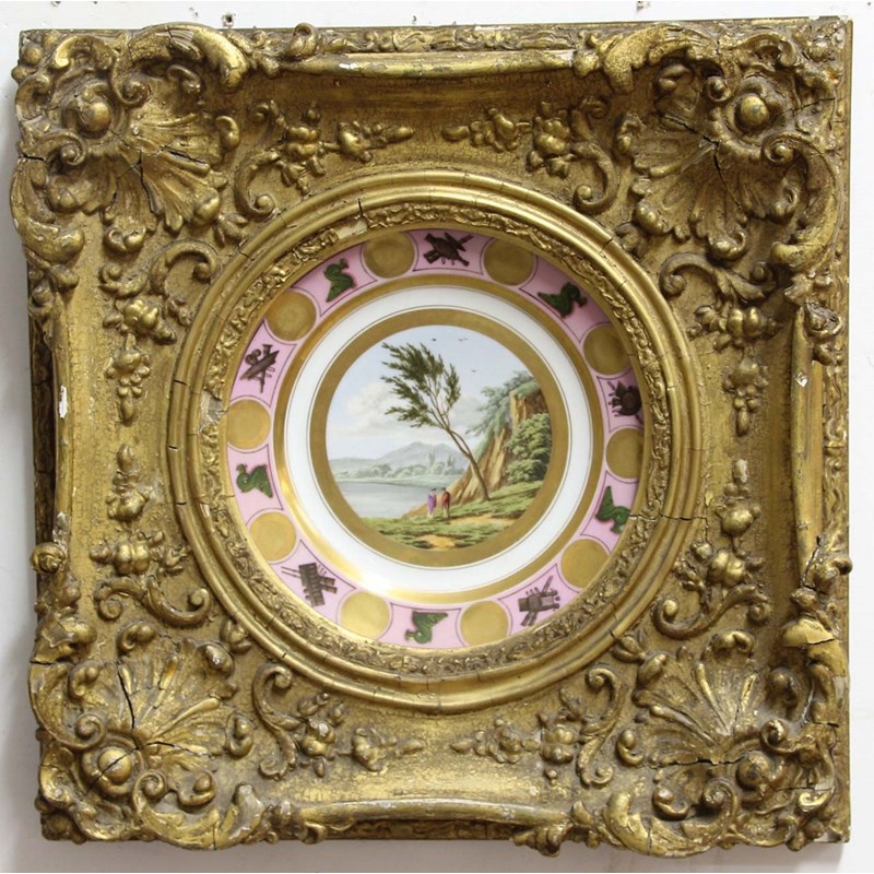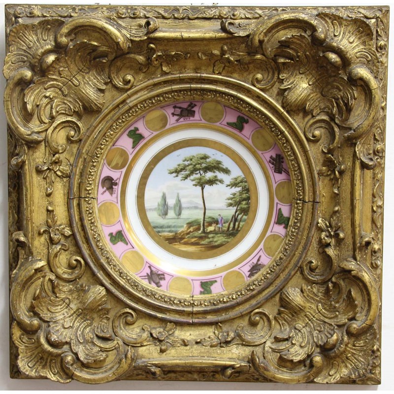 19th century, the circular aperture inside a square frame with scrolling foliate corners, now displaying a French porcelain plate with classical scenes, frame size 39cm x 39cm, aperture diameter 20cm (2)