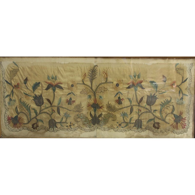possibly late 17th or early 18th century, worked with meandering flowers on an ivory silk ground, mounted on a silk backing, panel size 35cm x 95cm