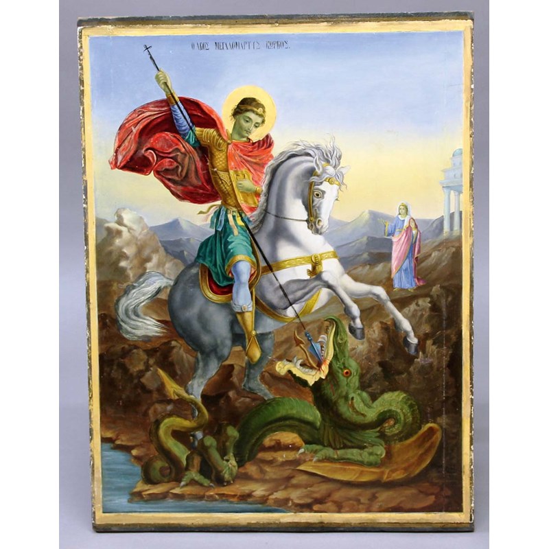 a Greek icon of the saint slaying the dragon, oil on panel, signed ?Dionysus Monagos? and dated 1900, 78.5cm x 58.5cm