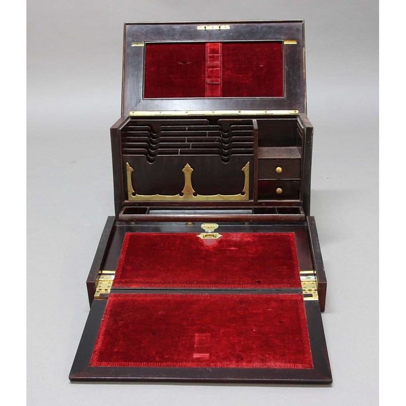 the hinged cover with velvet lining enclosing a fold out writing slope and pen tray, stationery rack and drawers, the lock stamped Bramah, London, height 30cm, width 43cm, depth 25cm