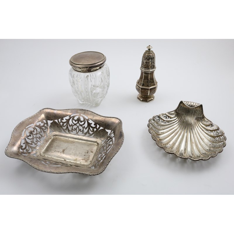 with pierced and engraved decoration, by R.Martin and E.Hall, Sheffield 1901, a mounted cut-glass biscuit jar with English import marks for London 1899, a pierced dish of shaped rectangular outline and an octagonal sugar caster; the latter 7.5" (19cm) high; 33.4 oz weighable silver (4)