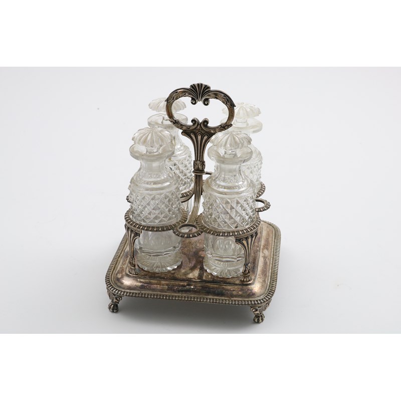 with a gadrooned square base, paw feet and foliate scroll handle, initialled "C" and fitted with four cut-glass, stoppered bottles (one with integral spoon), by Thomas Robinson (I), London 1815; 6.9" (17.5cm) high; 11.25 oz