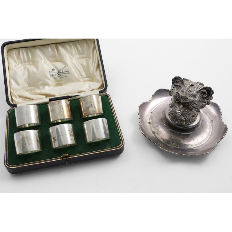 A GEORGE V CASED SET OF SIX PLAIN NAPKIN RINGS numbered "1" through to "6", by Martin, Hall & Co, Sheffield 1911 and a late Victorian plated novelty inkwell in the form of the head of a terrier with coloured glass eyes and a dished base; the latter 6.3" (16cm) diameter; 5.75 oz weighable silver (2)