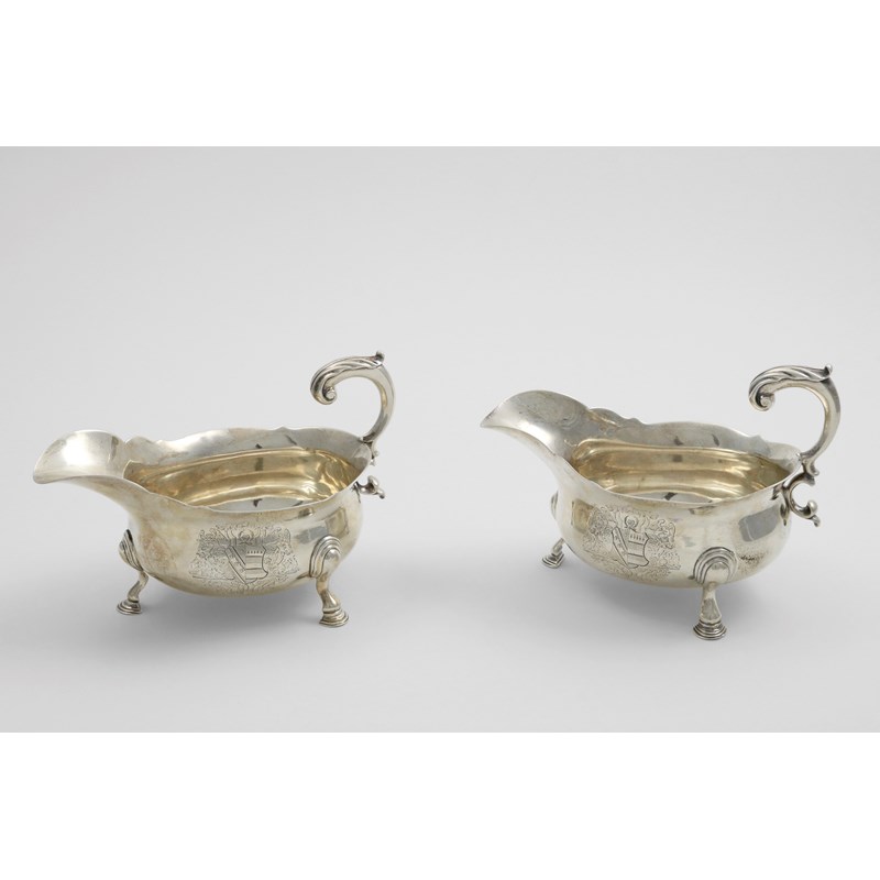 on three legs with leaf-capped, flying scroll handles and shaped rims, each engraved on one side with a coat of arms, maker's mark partially worn "I?", London 1740; 7" (18 cms) long; 18.1 oz (2)