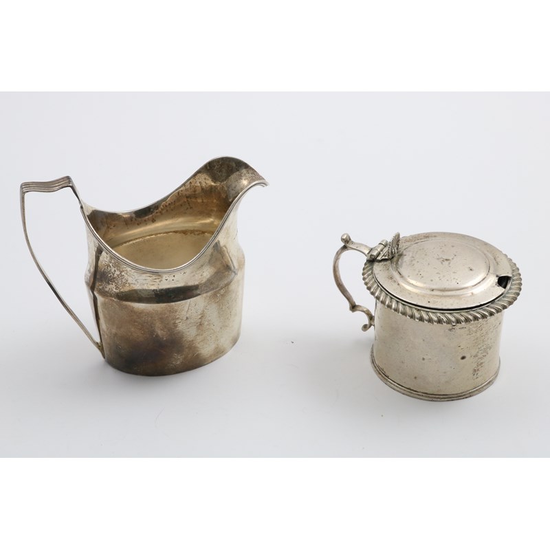 with a gadrooned border, crested, gilt interior and clear glass liner, by James Mckay, Edinburgh 1825 and a George III cream jug, maker's mark worn, London 1800; the latter 4" (10.2cm) high; 8.2 oz weighable silver (2)