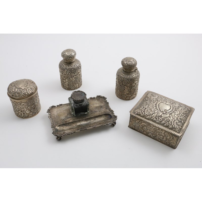 with rectangular base, wavy scroll border and a single, mounted glass ink bottle, by Charles Stuart Harris & Sons Ltd, London 1912, a late Victorian embossed rectangular dressing table box, monogrammed, gilt interior, by Nathan & Hayes, Birmingham 1891, a cylindrical box to match, same maker and date and a pair of embossed toilet bottles with glass liners and stoppers, monogrammed, by H.Matthews, Birmingham 1893; the bottles 4.5" (11.5cm) high; 17 oz weighable silver (5)