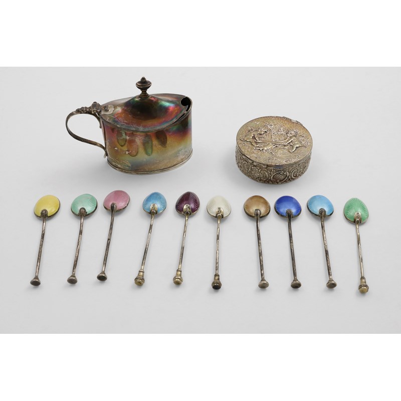 with putti on a see-saw in relief on the cover, (hinge A/F), a George III mustard pot (blue glass liner) and 10 enamelled coffee spoons; the box 2.6" (6.6cm) diameter; 8.5 oz weighable silver (12)