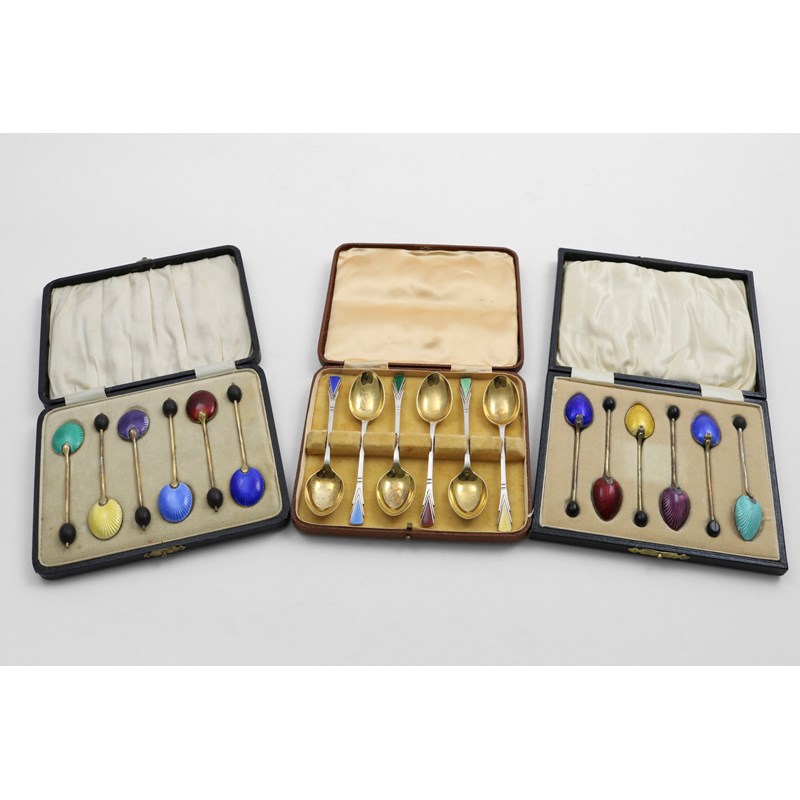 A cased set of 6 silvergilt bean-end coffee spoons with coloured enamel on the back of the bowls, by Suckling Ltd, Birmingham 1928, another similar cased set of 6 by Barker Brothers Ltd, Birmingham 1930 and another cased set of 6 teaspoons with coloured enamel, chevron-like terminals and gilt bowls, by Deakin and Francis, Birmingham 1956; 5 oz (3)