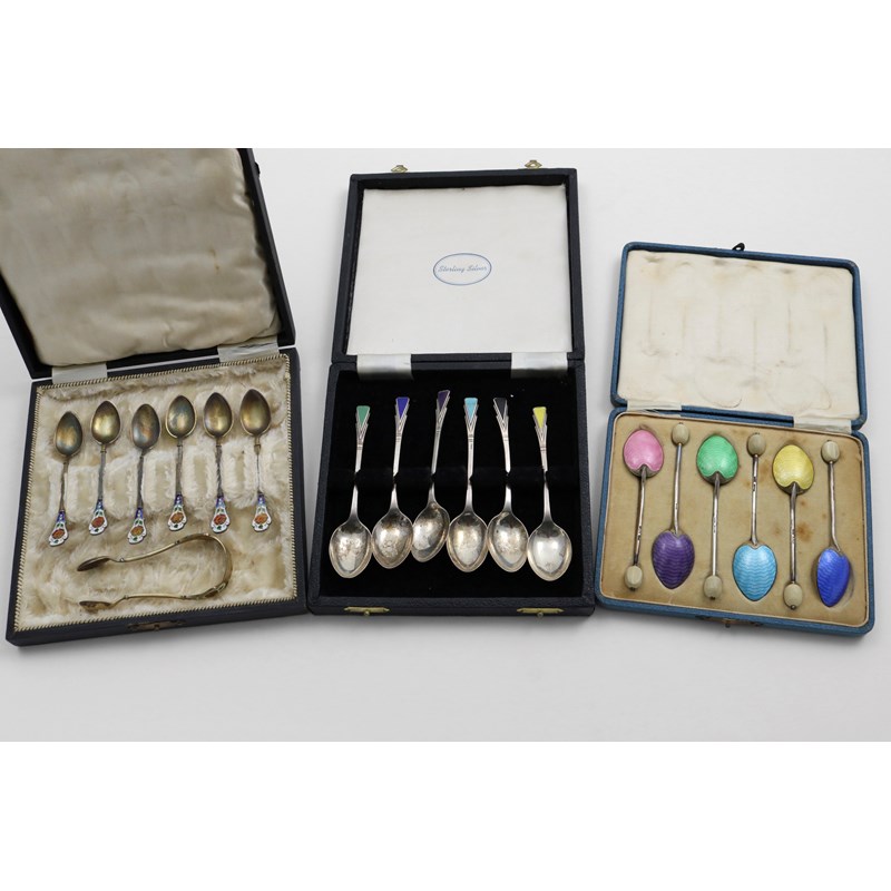 A CASED SET OF SIX ART DECO TEASPOONS with enamelled chevron terminals, by Deakin and Francis, Birmingham 1935/36, another cased set of 6 coffee spoons with bean-ends and coloured enamel on the backs of the bowls, by Turner & Simpson, Birmingham 1932 and a cased set of 6 Norwegian silvergilt and enamelled coffee spoons with a pair of matching sugar tongs; 5.5 oz (3)