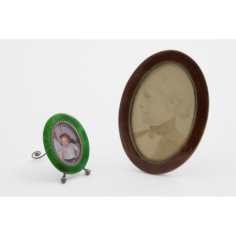 with a border of translucent bronze-coloured enamel over an engine-turned ground, gilt-metal easel back, together with a smaller frame with lime green enamel and a white pelleted border, wire easel stand, both by David Andersen, Oslo, 1910-1930; the larger one 5.3" (13.5cm) high