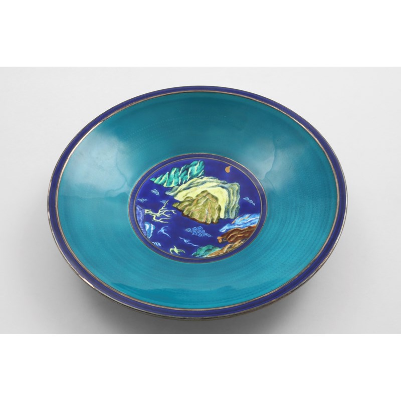 of shallow circular outline, on a collet foot, the interior enamelled in the centre with a polychrome scene resembling the Andaman sea, bordered by translucent aquamarine enamel and a royal blue rim, by J.Tostrup, Oslo 1950-60; 8.5" (21.5cm) diameter; 15 oz gross