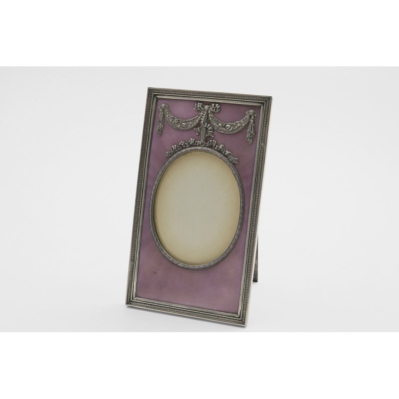 rectangular with an oval window and easel stand, decorated with translucent mauve enamel over a wavy, engine-turned ground, with applied floral festoons and a tied ribbon, by W.A. Bolin, Stockholm, 1919; 8.55" (21.7cm) high