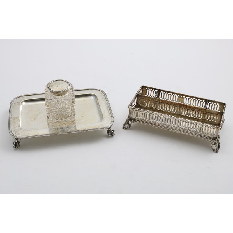of rounded oblong form with a reeded border, ball and claw feet and a mounted cut glass ink bottle in the centre, the cover dated "1879-1904", maker's mark "I&T", Sheffield 1900 and a George III small gallery inkstand (lacking bottles), initialled, by Philip Freeman, London 1774; the latter 6.7" (17cm) long; 14.6 oz weighable silver