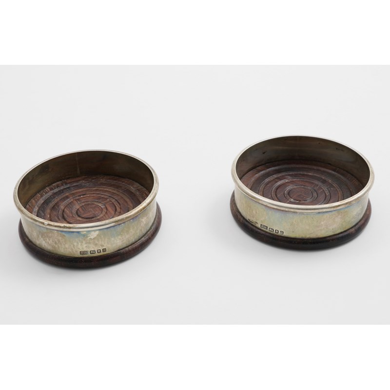 the sides with a lightly hammered finish and a plain, half-round, moulded border, the hardwood quartered bases with a turned interior, by Robert Welch, London 1970; 3.9" (9.8cm) diameter (2)