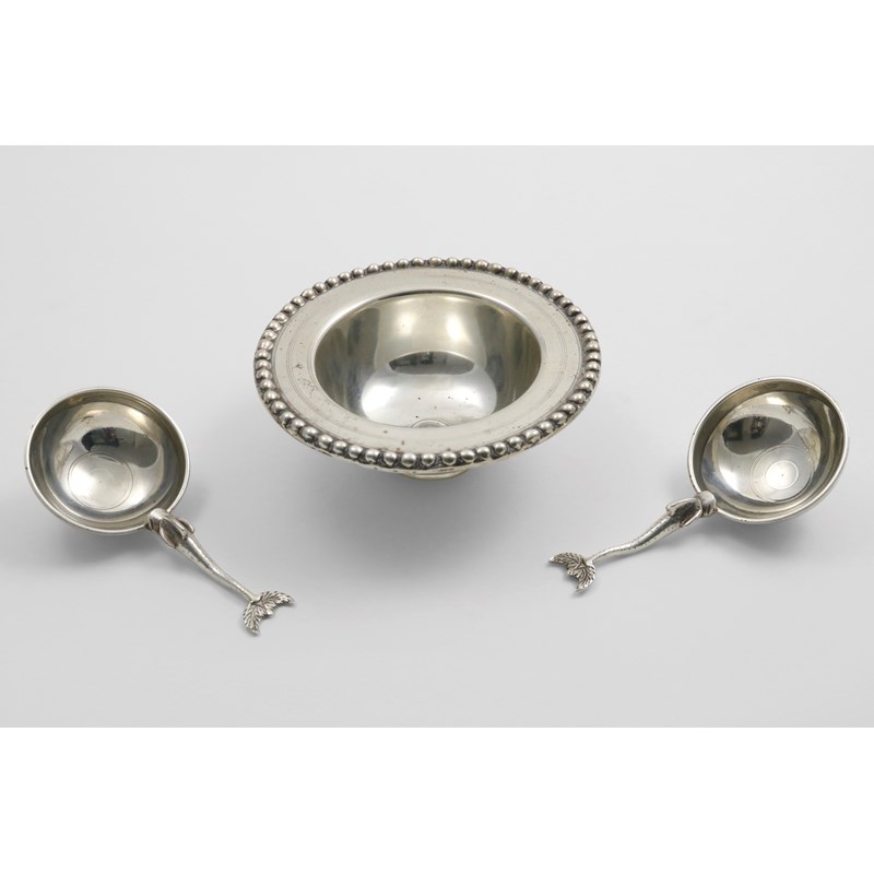 with a beaded rim and a collet foot and a pair of small ladles with circular bowls and cast dolphin handles, all by Brook & Son, Edinburgh 1936 and 1932 respectively; the bowl 5.5" (14cm) diameter; 12.6 oz (3)