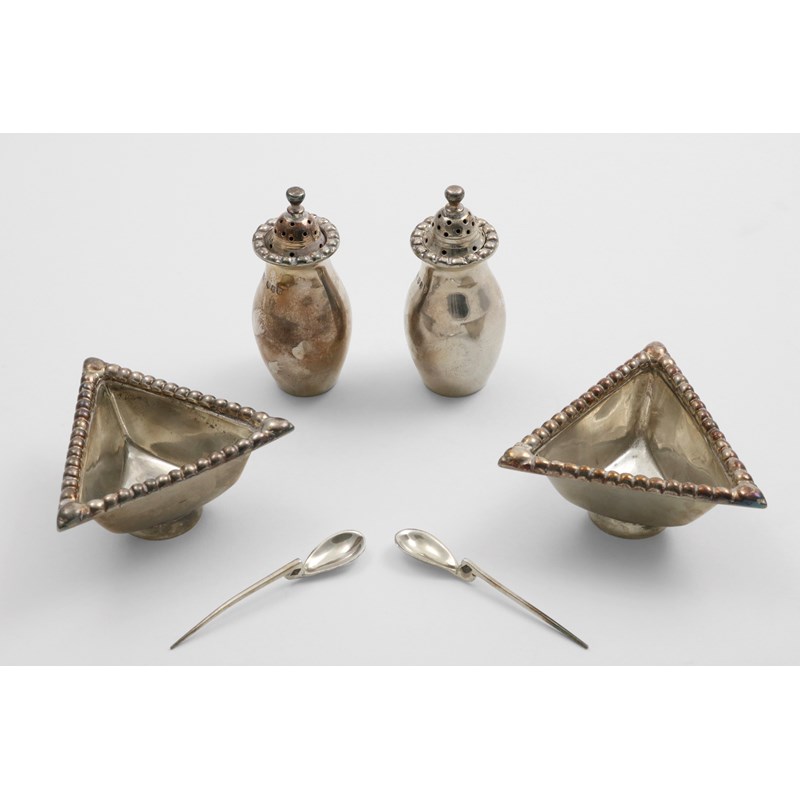A PAIR OF SCOTTISH TRIANGULAR SALTS a pair of condiment spoons and a pair of pepper casters, by Brook & Son, Edinburgh 1925/26; the casters 3" (7.5cm) high; 6.65 oz (6)