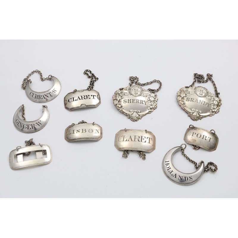 Four various antique wine labels with canted corners (PORT, LISBON, CLARET, & CLARET), a pair of late 20th century "stamped out" labels with masks (BRANDY & SHERRY), a Victorian label with a vacant slot for inserting a title of your choice, and three Old Sheffield plated crescent wine labels (GINGER-WINE, HOLLANDS, & CURRANT-W); the latter three 1.75" (4.5 cms) wide; 3.1 oz weighable silver (10)