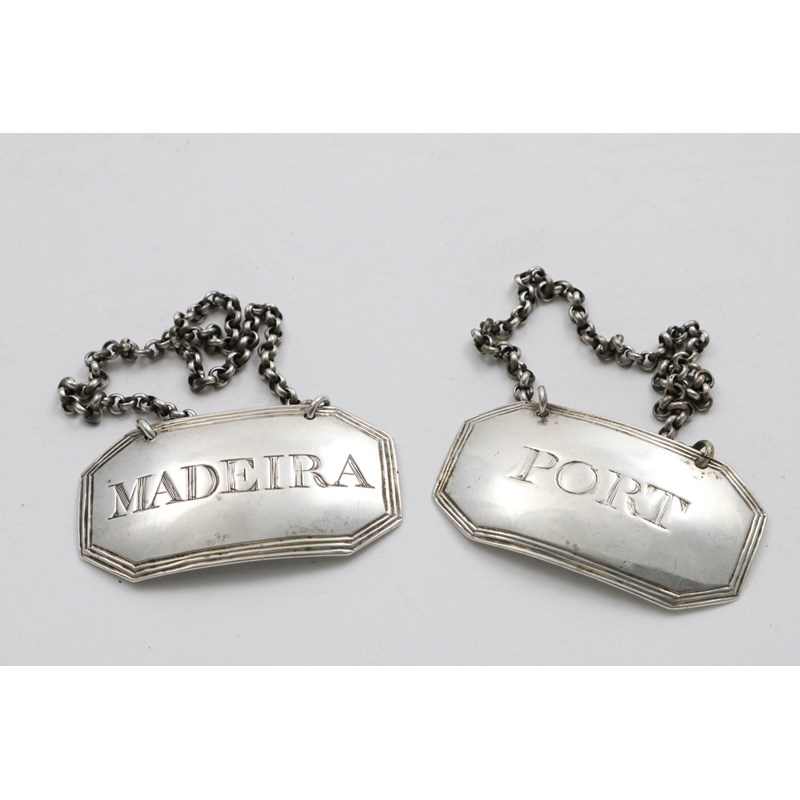 of canted oblong form with reeded borders, incised "PORT" and "MADEIRA", maker's mark only "IG" (struck three times on each) by J. Gordon of Aberdeen 1800-1810; 1.8" (4.6cm) long; 0.65 (2)