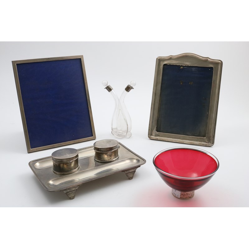 monogrammed, with two glass liners, by Hawksworth Eyre & Co, Sheffield 1907, a mounted photograph frame with an arched top, an American mounted photograph frame, a mounted red glass dish and a mounted glass oil and vinegar bottle, with stoppers; the inkstand 10.25" (26cm) long; 26.25 oz weighable silver