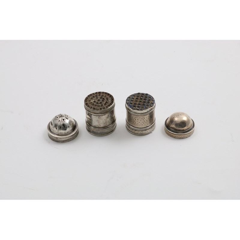 with a domed cover and engraved decoration, by Samuel Pemberton, Birmingham 1816 and another slightly larger, plain example with a pierced cover, by Joseph Taylor, Birmingham 1798; the latter 1.4" (3.5cm) high; 0.7 oz