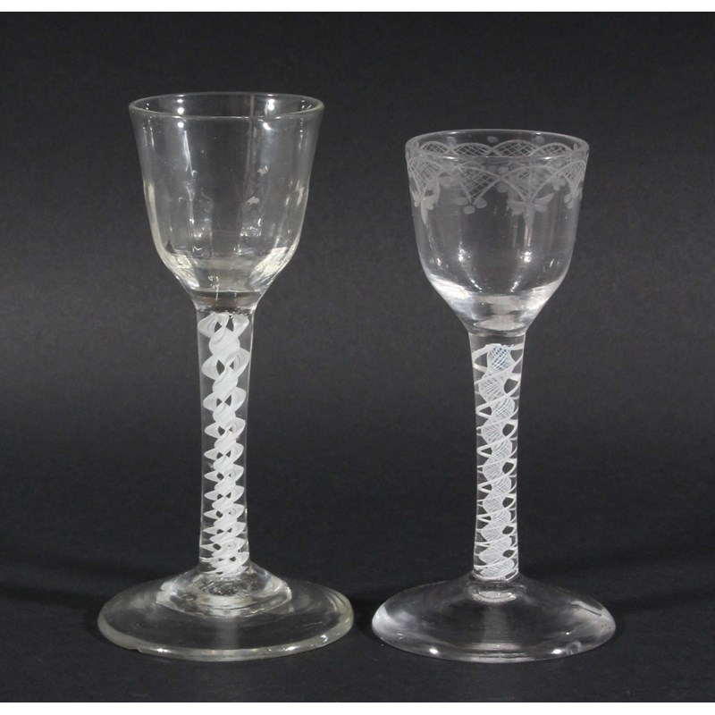 the rounded bowl with basal moulding above a white enamel triple helix and spreading foot, height 15cm; together with another with an engraved rim, a central gauze inside a double helix on a spreading foot, height 14cm (2)