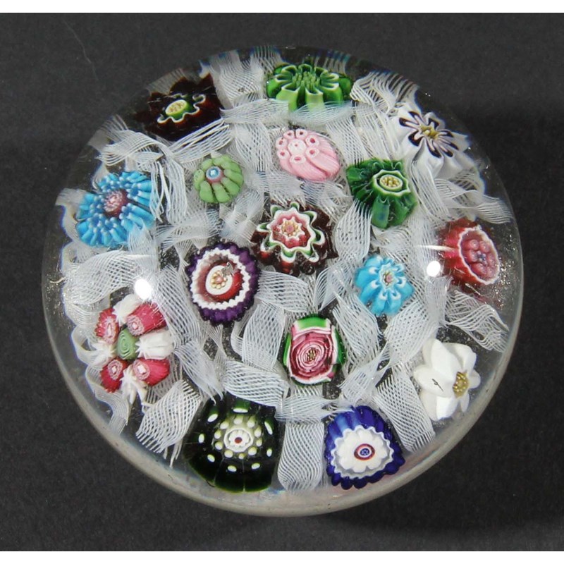 CLICHY PAPERWEIGHT, mid 19th century, with sixteen canes, including a rose, on a scrambled latticino ground, diameter 7.5cm