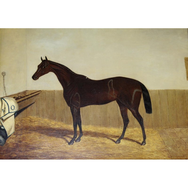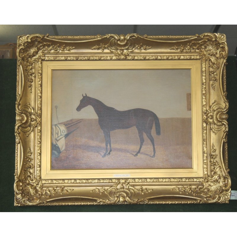 AFTER JOHN FREDERICK HERRING (1795-1865) BEESWING, IN A STABLE Oil on canvas, period gilt frame, 42.5 x 59.5cm. * Beeswing, a bay mare by Dr Syntax out of Ardrossan, was a legendary racehorse. She won the 1835 Champagne Stakes at Doncaster, and the Newcastle St. Leger the following year. She won the Gold Cup at Doncaster on four occasions: 1837, 1840, 1841 and 1842. Widely regarded as the finest mare in Britain in her day, she won thirty one races in all and led the 1842 Ascot Gold Cup all the way from start to finish. This was to be her final race but she was retired to stud where she proved to be an excellent brood mare. This subject is probably derived from Charles Hunt's aquatint of 1842.