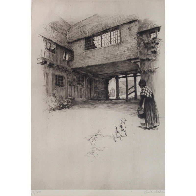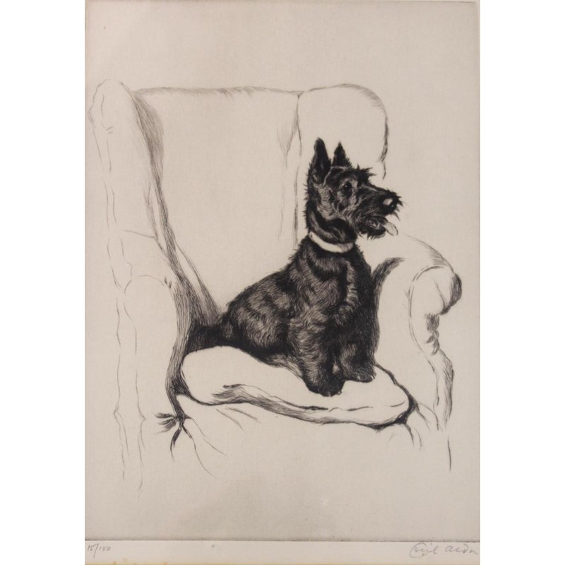 CECIL CHARLES WINDSOR ALDIN (1870-1935) SCOTTISH TERRIER IN AN ARMCHAIR; PENSHURST, KENT Two, etchings with drypoint, each signed and numbered 15/150 and 73/100 28.5 x 21cm; and 29.5 x 21cm. (2)