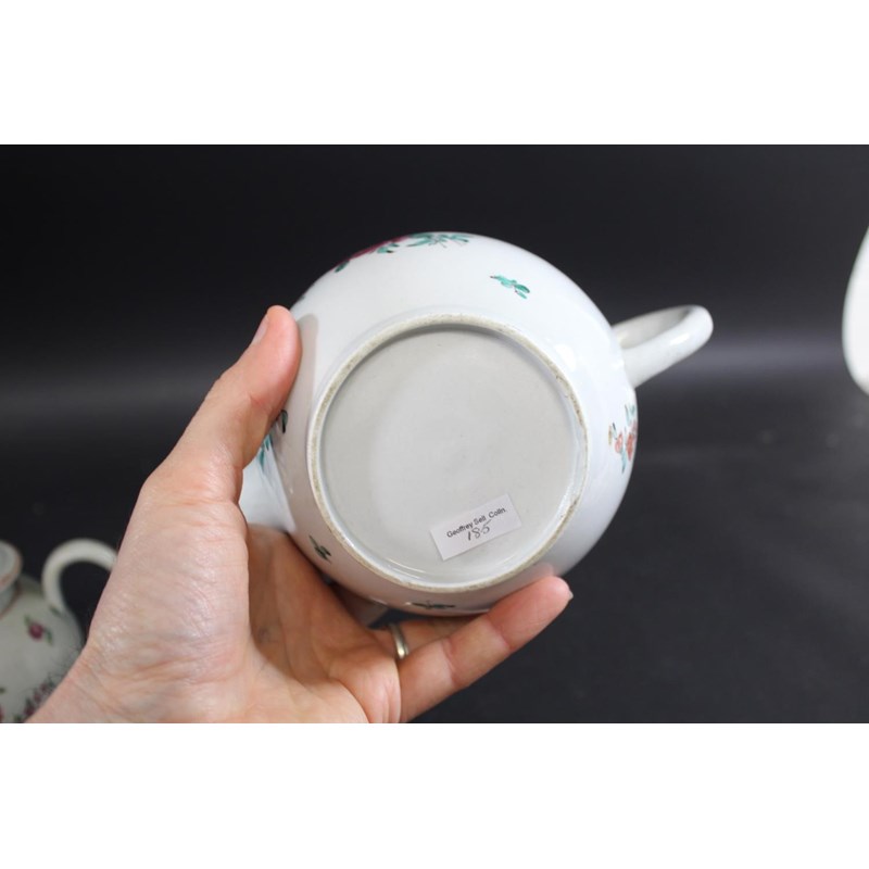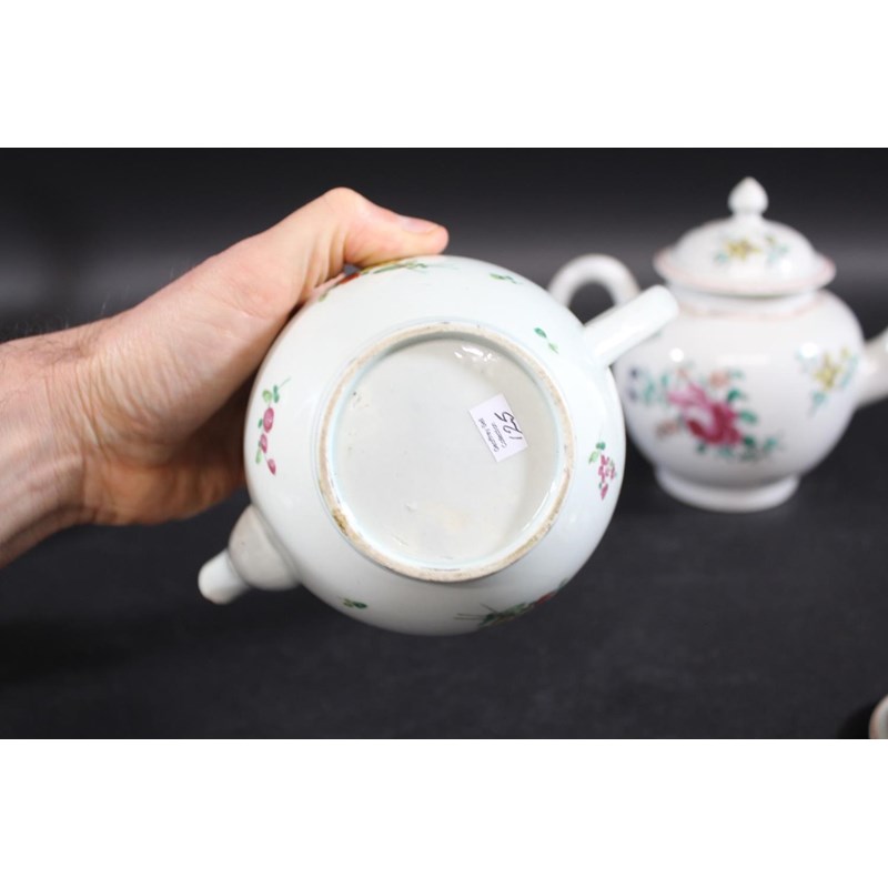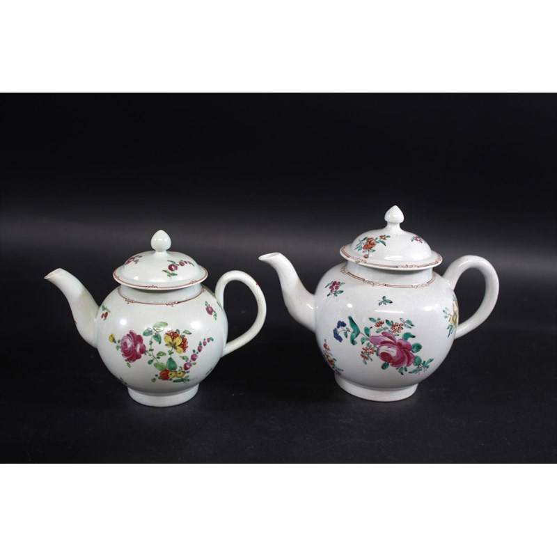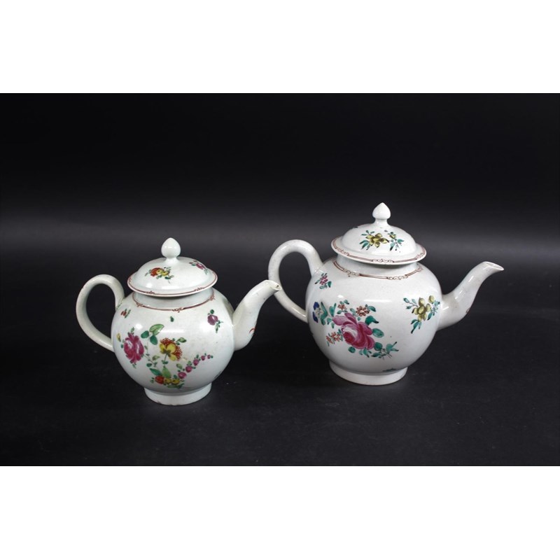 the domed cover with a pointed finial, painted with colourful flower sprays and smaller scattered sprigs, with four red bean borders, 15cms high (finial restored, section of rim of cover restored, several small vertical cracks at rim of teapot). Also with a Liverpool Philip Christian teapot and cover, with a domed top cover and painted with sprays of flowers, 17.5cms high (chip to lid and possible restoration to finial, small chip to spout). (2)