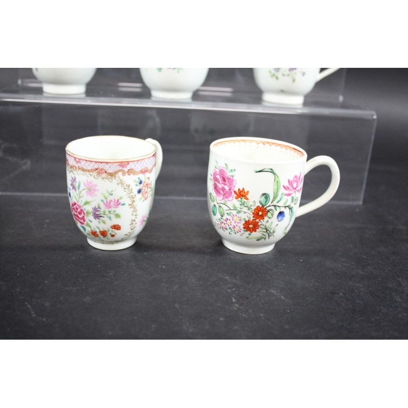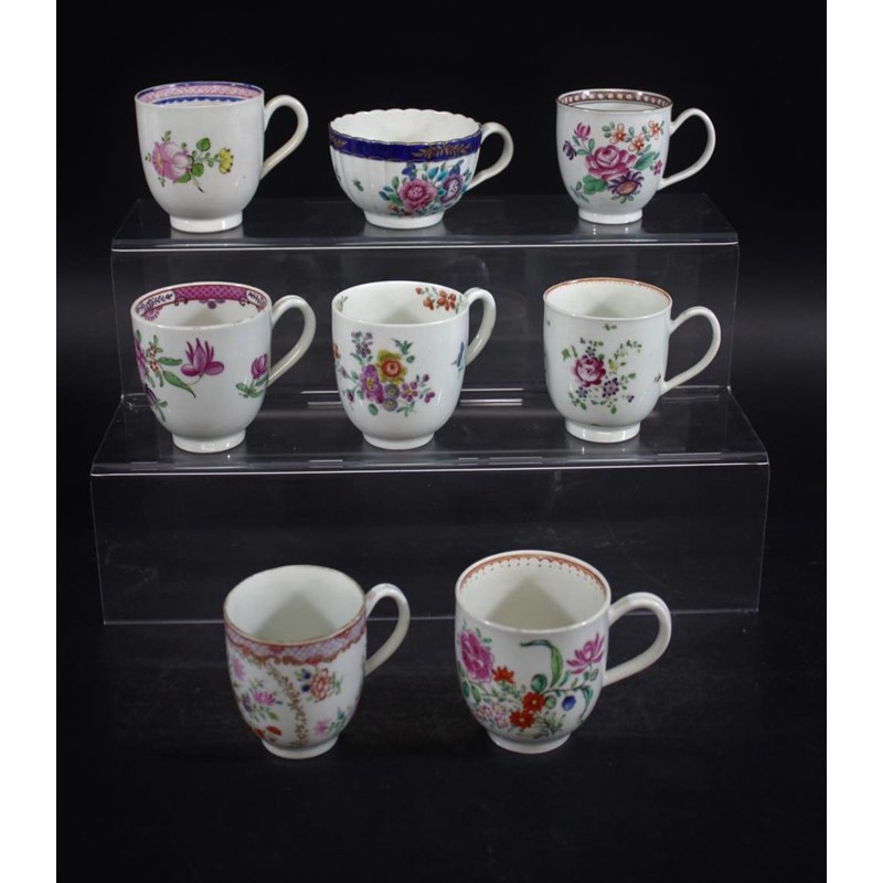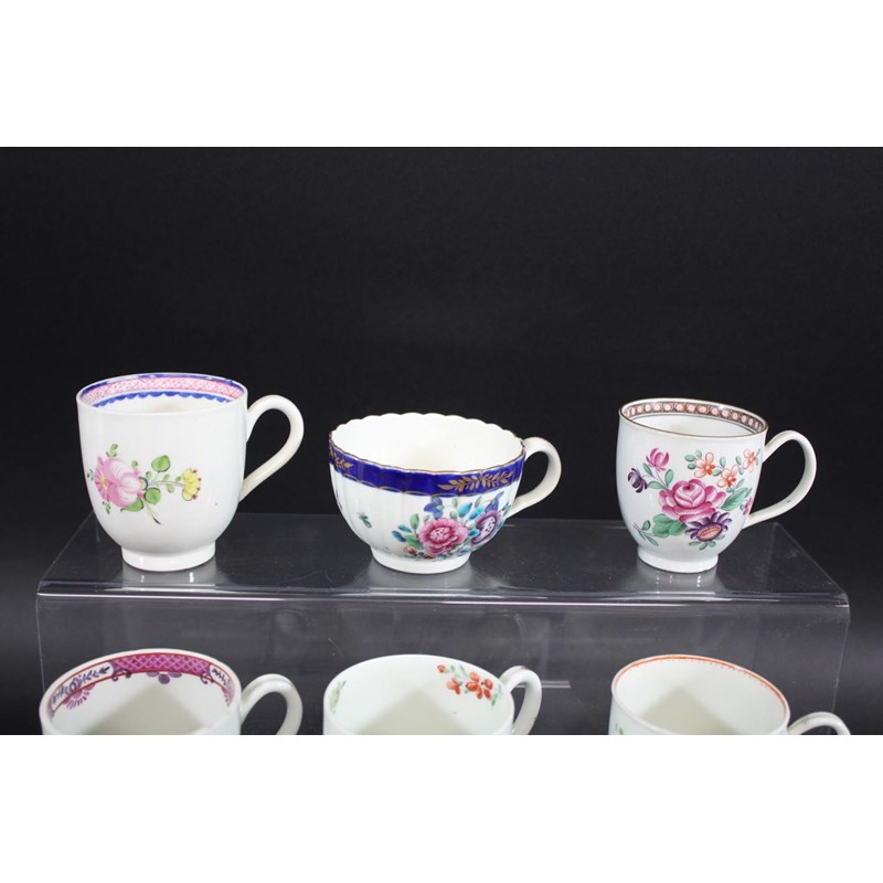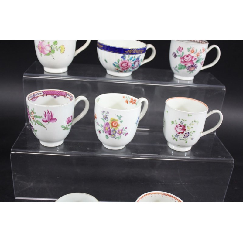 various coffee cups including a Worcester coffee cup with loop handle and painted with sprays of flowers, 7cms high, a Worcester fluted teacup with crescent mark, a Worcester coffee cup with sprigs of flowers to the exterior and interior, a Worcester coffee cup painted with flowers within a gilded border (Compagnie des Indes), and various other coffee cups. (8)