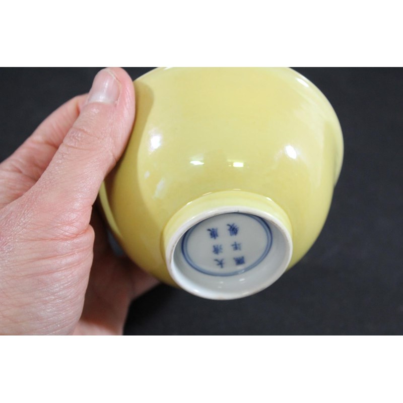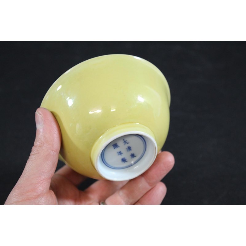a small Kangxi mark and period Imperial yellow monochrome bowl, with a rounded body and slightly flared rim. The interior and exterior with a yellow glaze, with two feint hairline cracks to the body. With Kangxi six character marks within a double circle. 11cms diameter, 5.5cms high