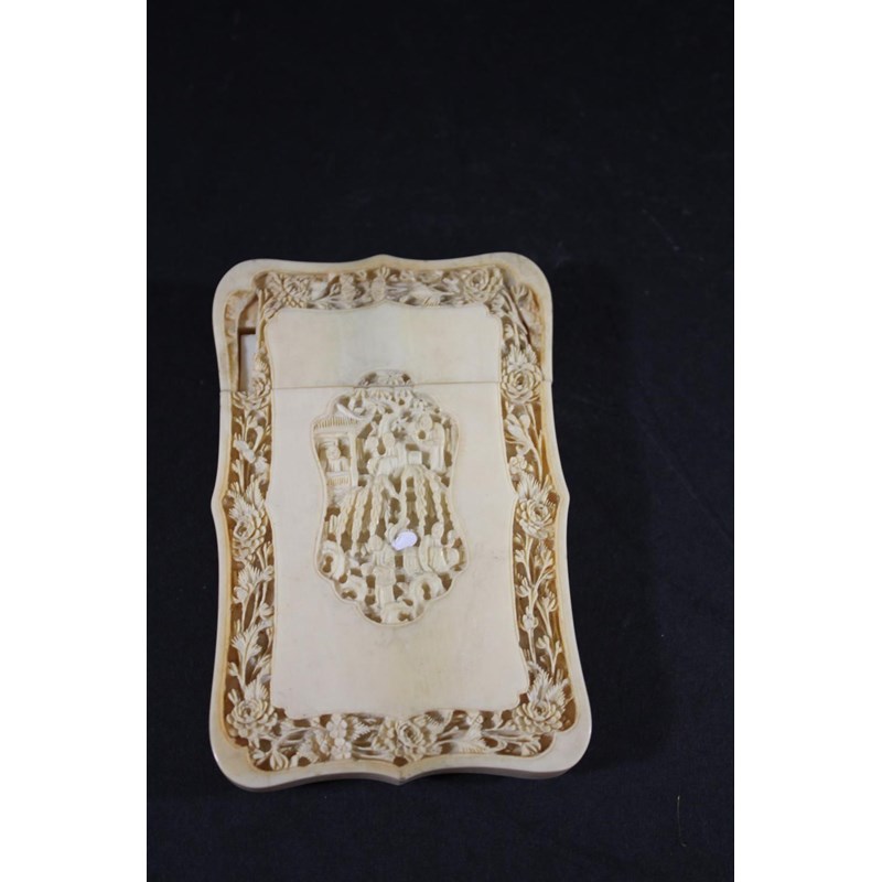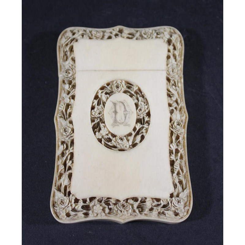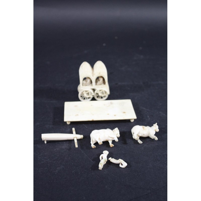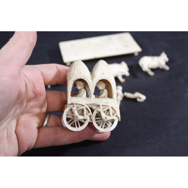 the central panel with initials surrounded by carved flowers, with a further border of flowers around the rim, the reverse with a carved scene of various figures, 11cms high. Also with a carved ivory oxen with cart with figures inside, damages. (2)