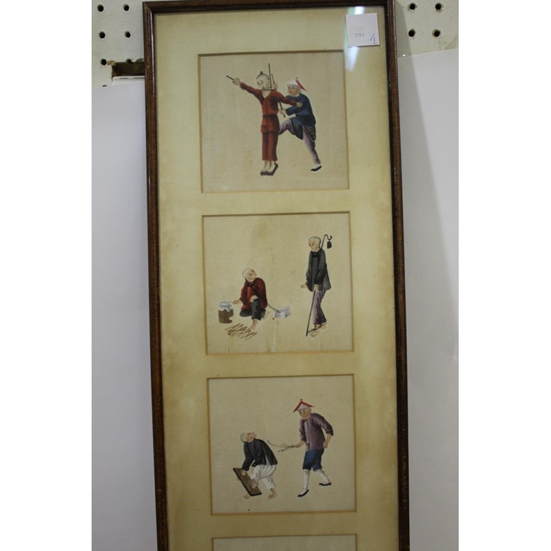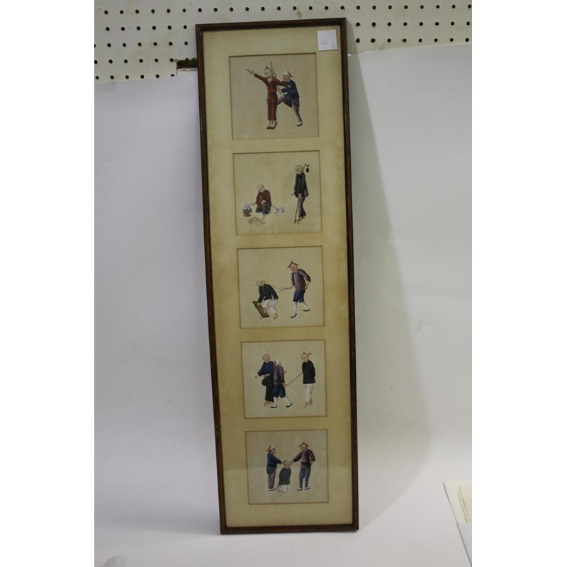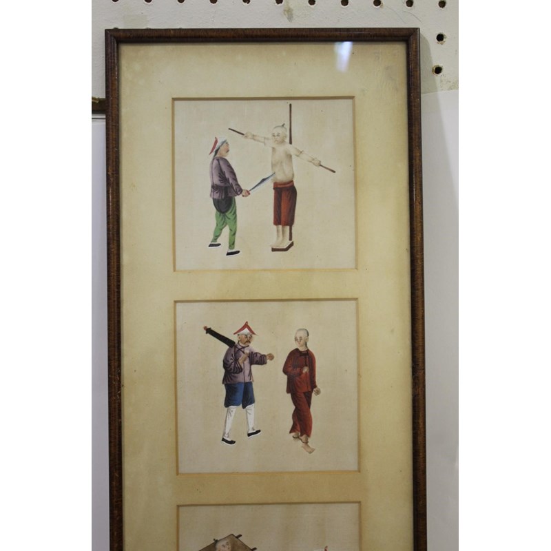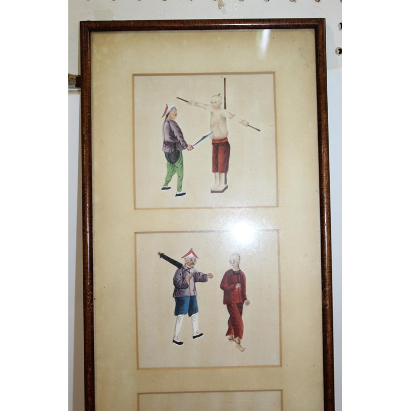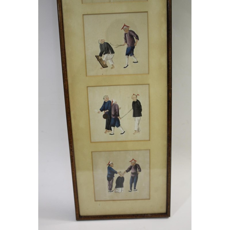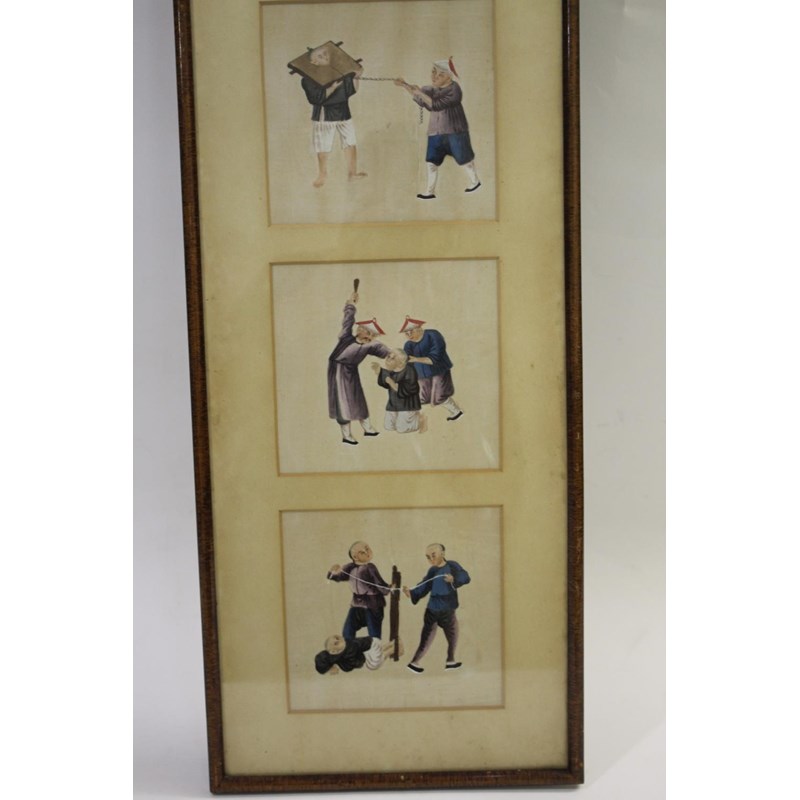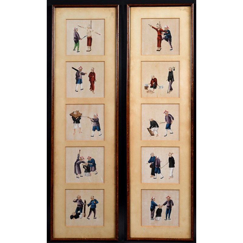 Qing Dynasty, two frames containing ten various pith paintings, each painted with various forms of punishment or torture. Each painting 13.5cms by 13cms, frames 86cms by 24cms. (2)