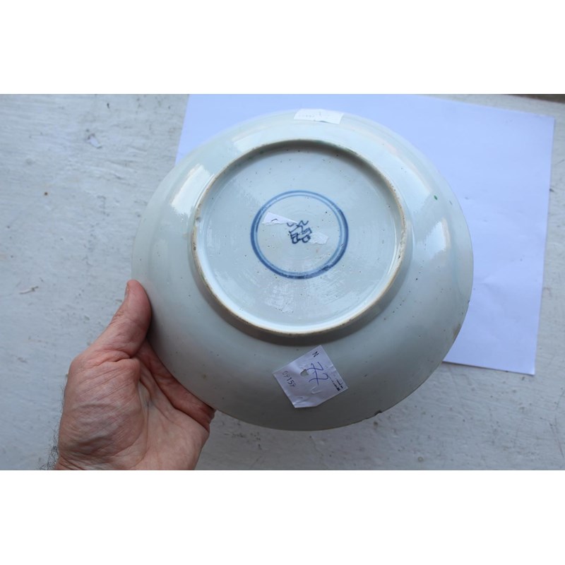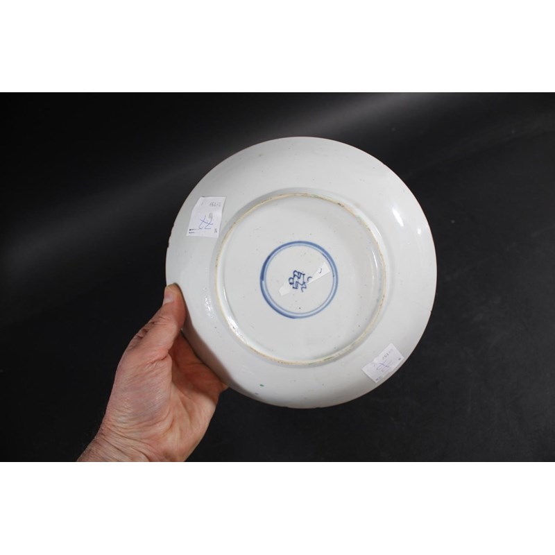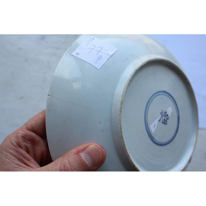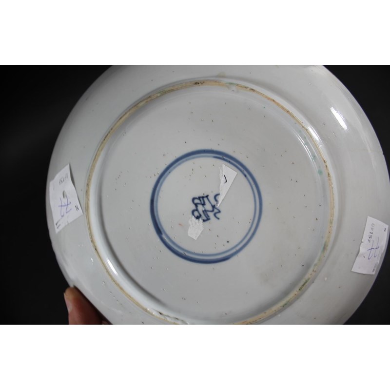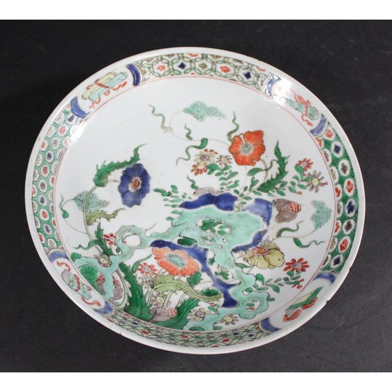 Kangxi period, the centre painted with flowers, the inner rim painted with various objects including scrolls, book etc, and with sections of flower heads. With a mark within a double circle, dish cracked and with chips to the rim. 21.5cms diameter