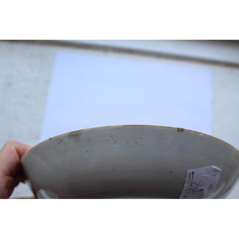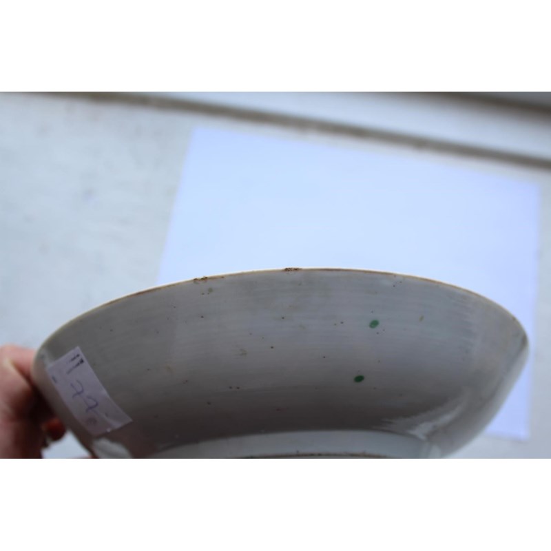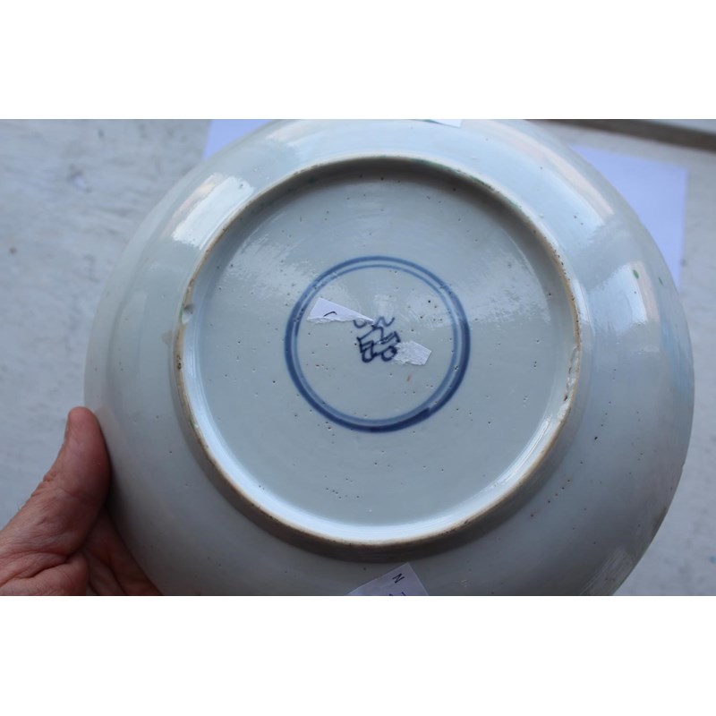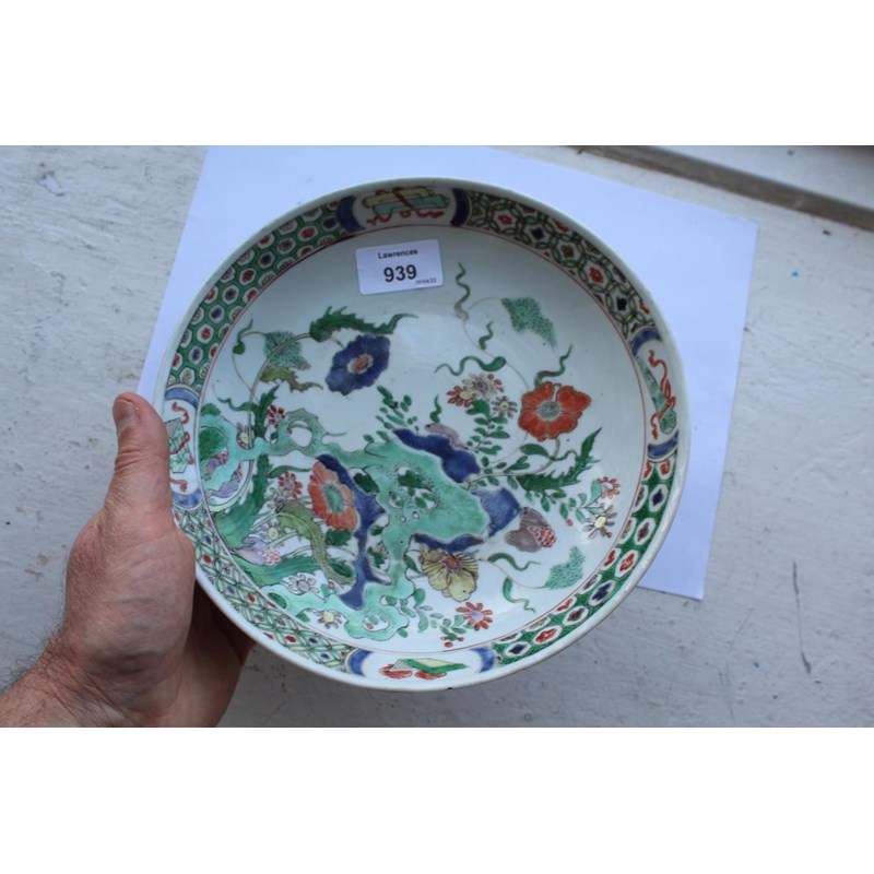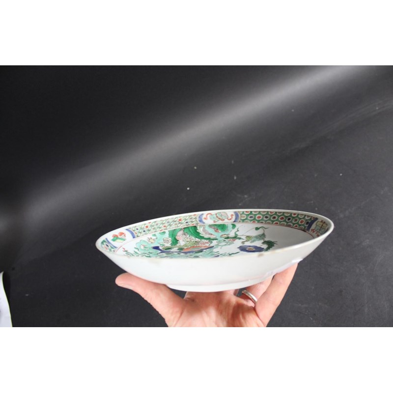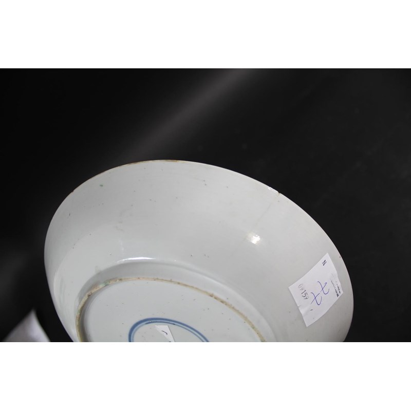 Kangxi period, the centre painted with flowers, the inner rim painted with various objects including scrolls, book etc, and with sections of flower heads. With a mark within a double circle, dish cracked and with chips to the rim. 21.5cms diameter