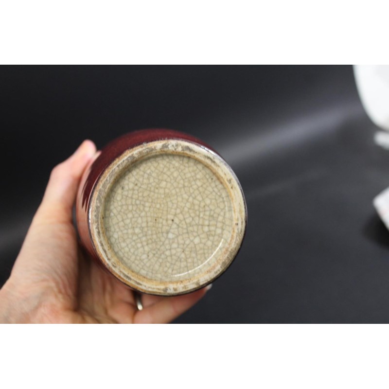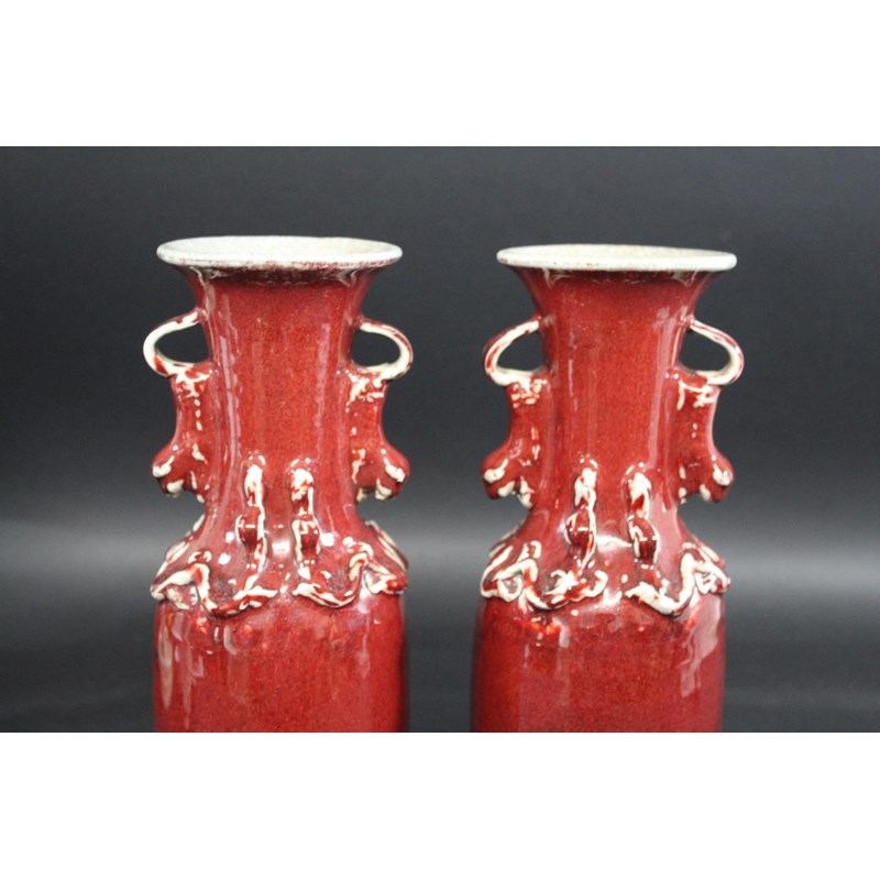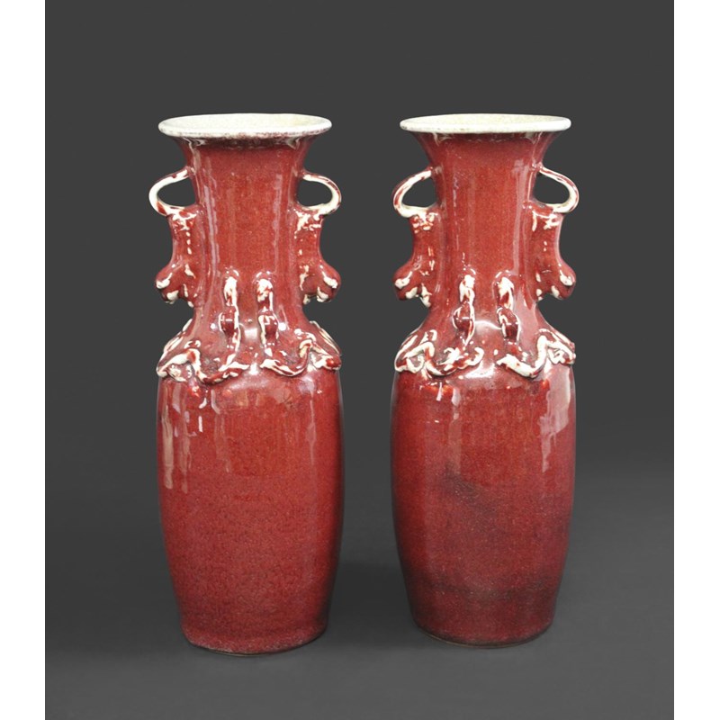 CHINESE SANG DE BOEUF VASES late 19thc, a pair of vases with a sang de boeuf glaze, with applied lion handles and chi dragons to the top of the shoulder. 29.5cms high. (2)