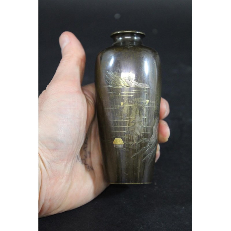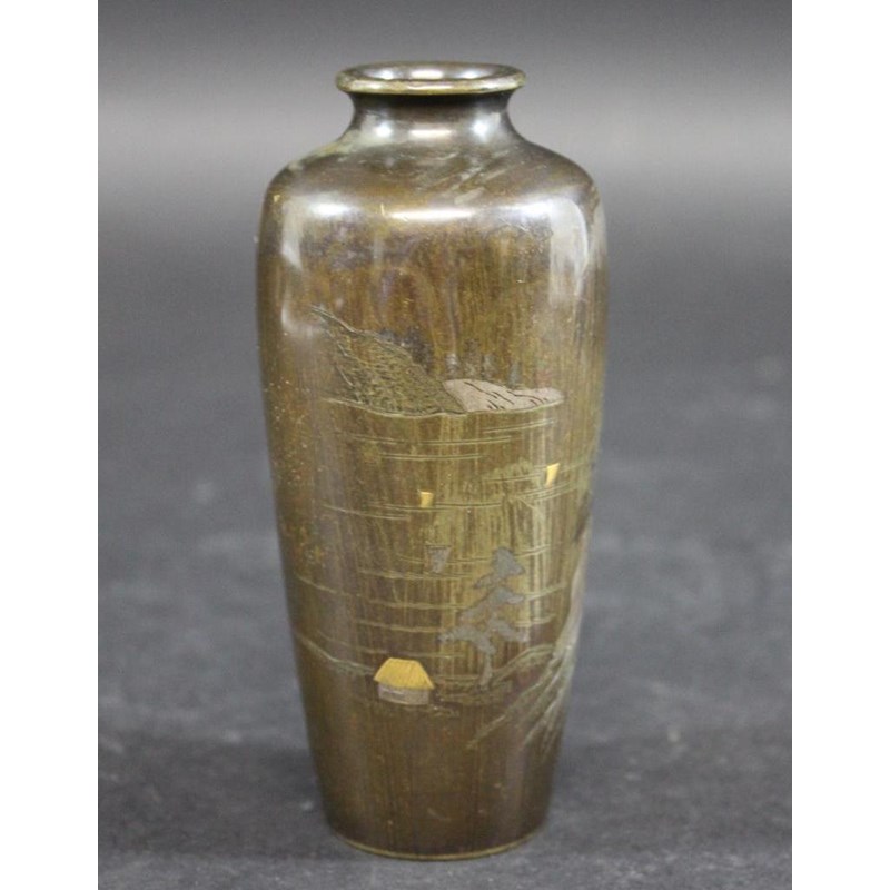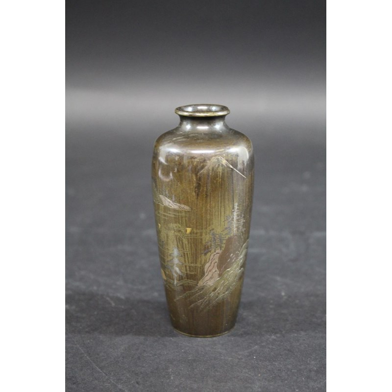 a small bronze vase inlaid in a variety of metals, designed with a house within a landscape and Mount Fuji in the background. Signed on one side, 12.5cms high
